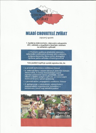 Mladí chovatelé zvířat, zapsaný spolek, je nestátní nezisková organizace. Navazuje na chovatelské tradice, které mají v naší republice velkou tradici. Spolek je dobrovolným, zájmovým uskupením dětí, mládeže a dospělých s kladným vztahem ke zvířatům a přírodě. Umožňuje jim rozvíjet svoji zájmovou činnost, vzdělávat se v této oblasti činnosti a aktivně se zúčastňovat akcí spolku i akcí pořádaných pobočnými spolky a dalšími organizačními jednotkami. Posláním spolku je především zájmové a neformální vzdělávání a činnosti dětí a mládeže, podpora domácího chovu zvířat, ekologická výchova, péče o přírodu a životní prostředí. Své členy vede k vlastenectví a hrdosti na svou zemi, ke společenské odpovědností a udržitelnému rozvoji, k vytváření odpovědnější společnosti, která se ve svém počínání navrací k tradicím a hodnotám. Spolek funguje na dobrovolnické bázi a vede k dobrovolnictví i naše děti a účastníky pořádaných akcí. Toto poslání naplňuje spolek zejména tím, že: